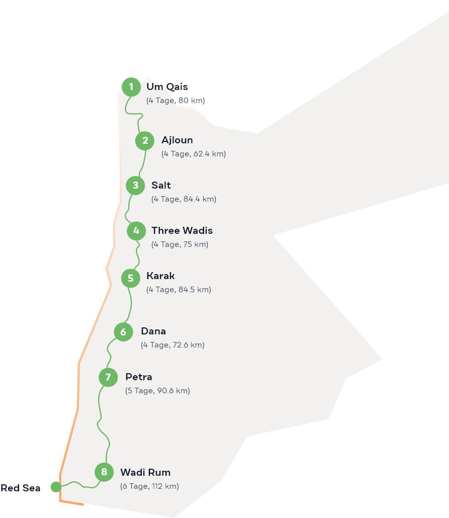 "Der Jordan Trail ist ein Fernwanderweg in Jordanien, der die gesamte Länge des Landes von Um Qais im Norden bis nach Aqaba im Süden verbindet. Er bietet 40 Tage Wanderzeit auf einer Strecke von mehr als 650 Kilometern und führt durch 52 Dörfer und Städte auf seinem Weg. Der Weg durchquert die vielfältigen Landschaften und Aussichten des Landes, von den sanften bewaldeten Hügeln im Norden, den zerklüfteten Wadis und Klippen mit Blick auf den Jordangraben, die rosafarbene Felsenstadt Petra, die dramatischen Sandstrände und hoch aufragenden Berge im Wadi Rum bis hin zum kristallklaren Wasser des Roten Meeres.